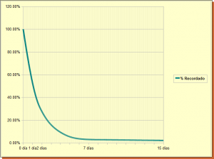 - Antes del Repaso número 2 ha pasado alrededor de una semana. Si te fijas en la primera función (Curva original del Olvido según Ebbinghaus), para entonces ya casi no recuerdas nada (2-3%). Si hiciste el Repaso número 1, seguramente recordarás entre un 80 y un 90% de la información. Ahora, si haces el Repaso número 2, vuelves a refrescar los datos y recuperas la marca de 100%.